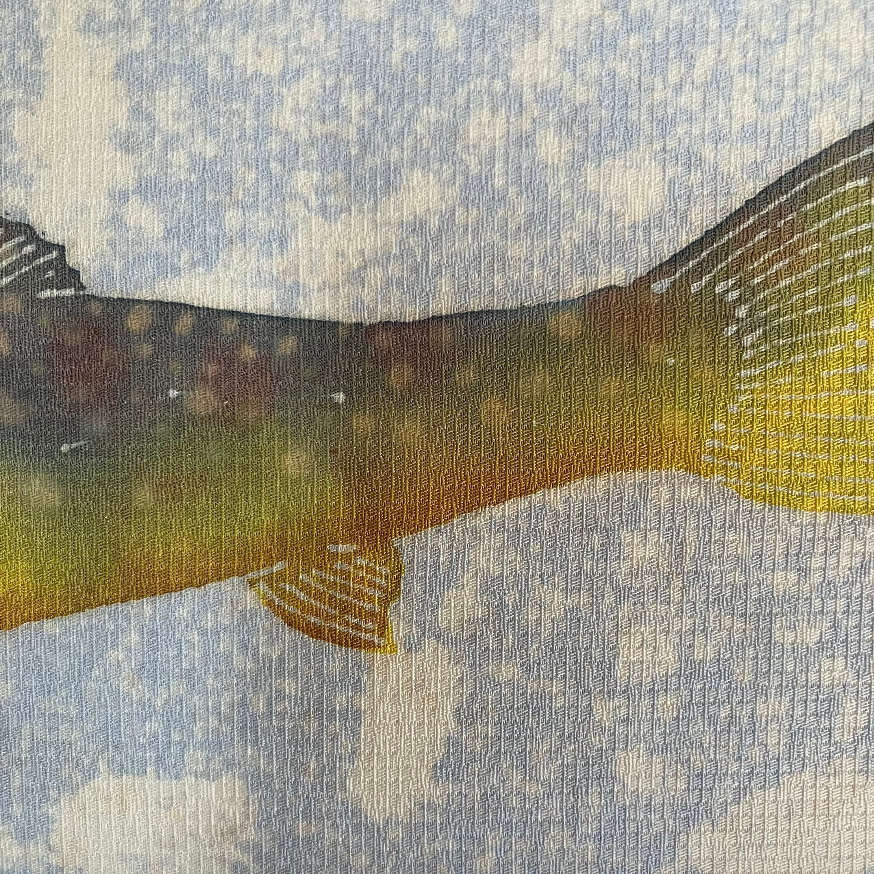 ワイルドでアートなインテリアアクセント、アートパネルIWANAtrout TG-01。ワックス(蝋)を使った染め技術"バティック"と"京友禅染"を融合させたミクスチャアートは、まるで魚の鱗のような独特の模様が特徴です。製作者である染め作家が、趣味であるフライフィッシングからインスピレーションを得て、情熱を込めて制作しました。